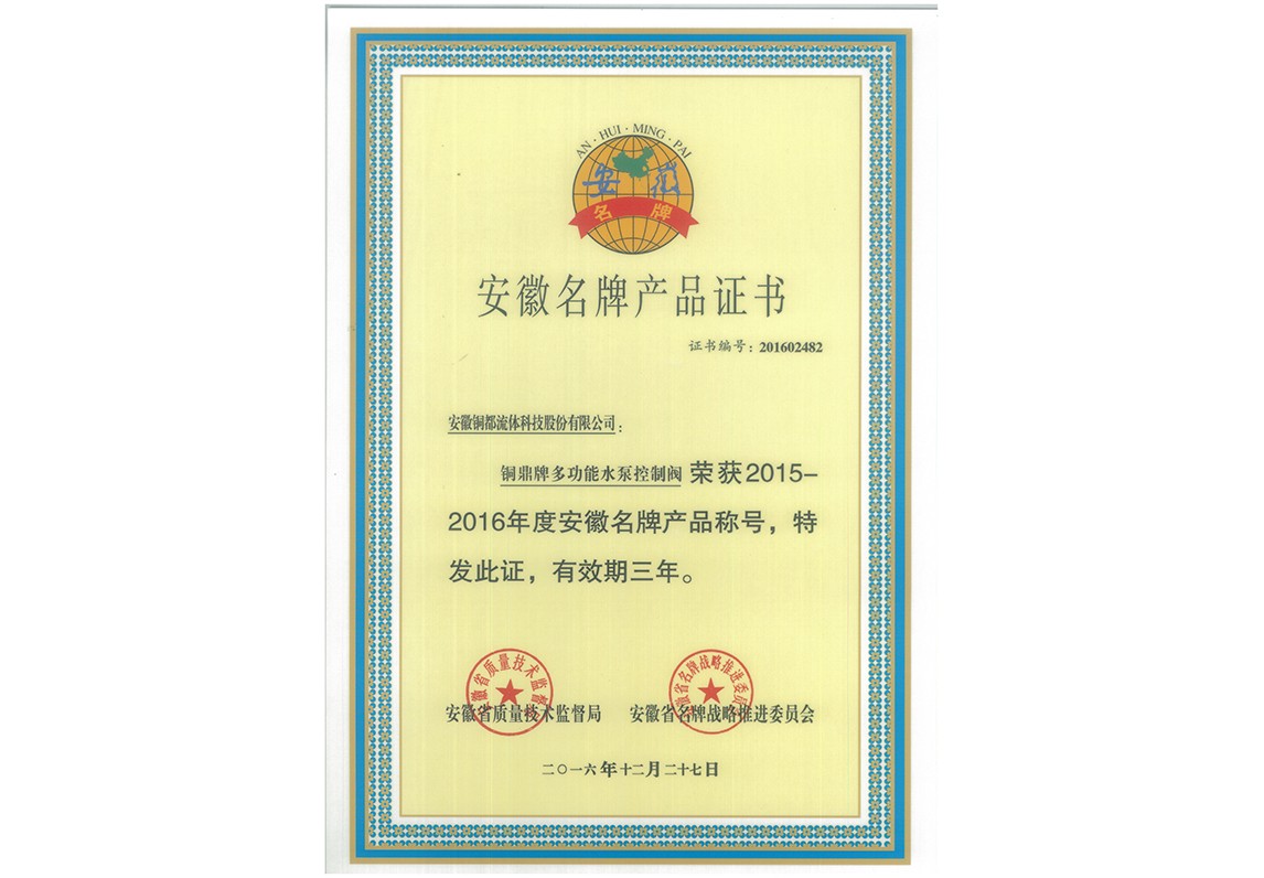 多功能水泵控制閥-名牌產品證書