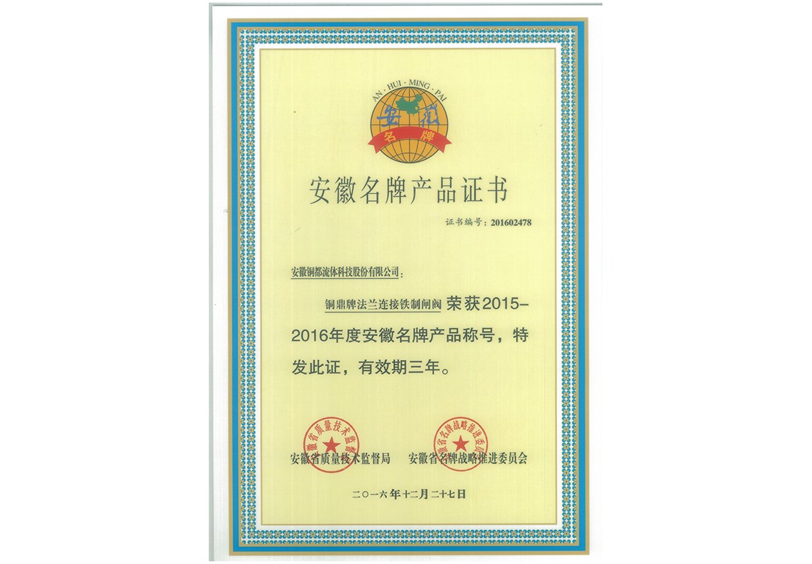 閘閥-名牌產品證書