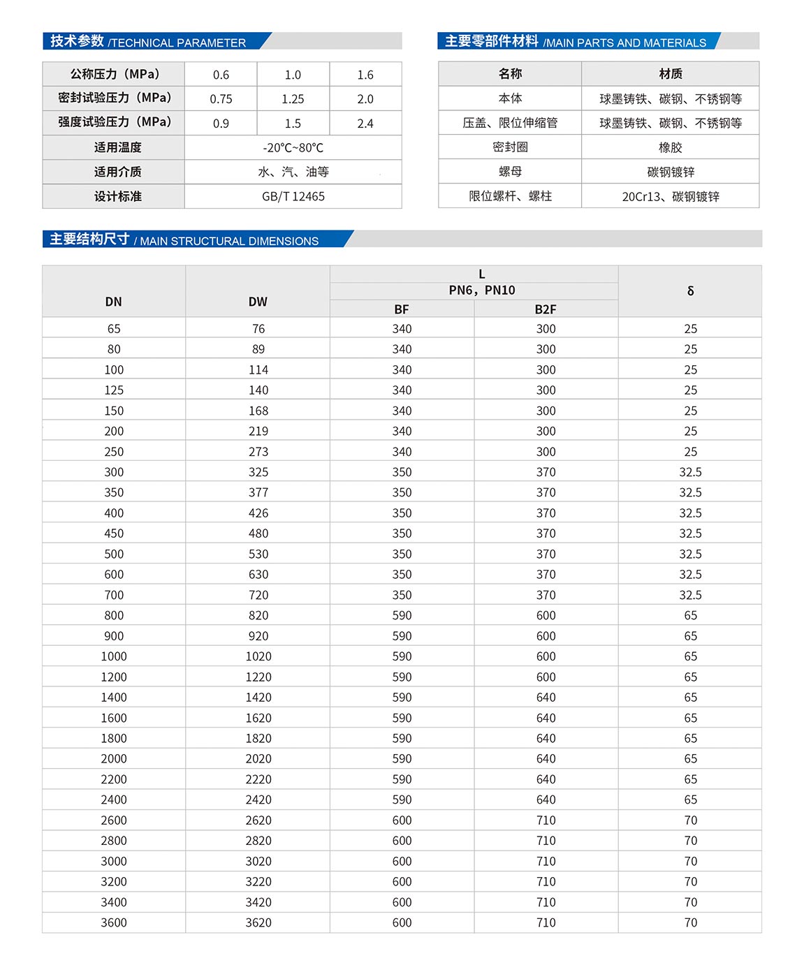 松套限位補償接頭可廣泛與蝶閥、閘閥、止回閥、截止閥等閥門及管道配套使用,可降低工程費用能有效解決閥門裝卸困難。主要用于管道與閥門連接,可防止管道在外部作用力及熱脹冷縮引起的內(nèi)部作用力較大時,拉脫伸縮接頭,造成不必要的管道泄漏事故。